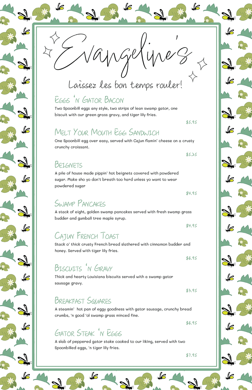 This menu project was designed in InDesign and incorporates a Cajun influence inspired by my Louisiana heritage. The goal was to blend professional design with personal cultural roots, creating a menu that feels both authentic and visually engaging.